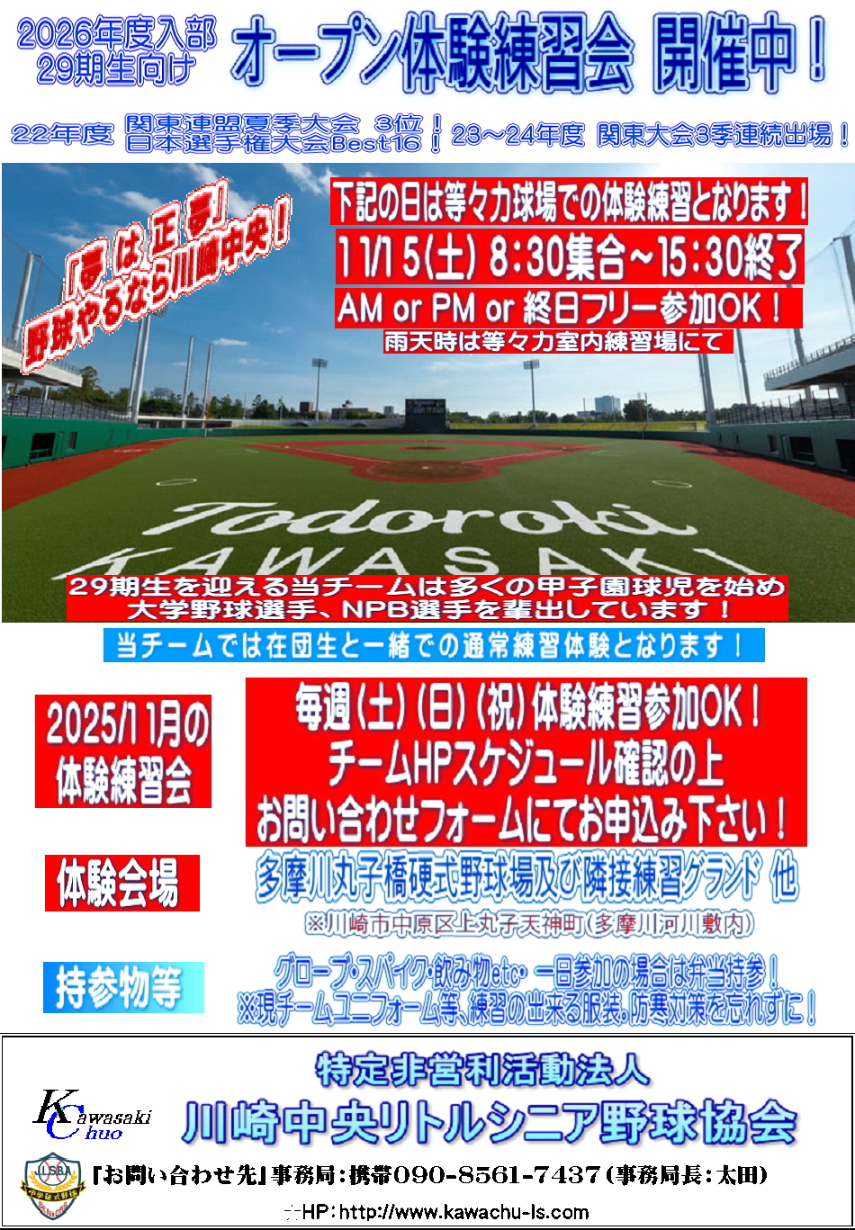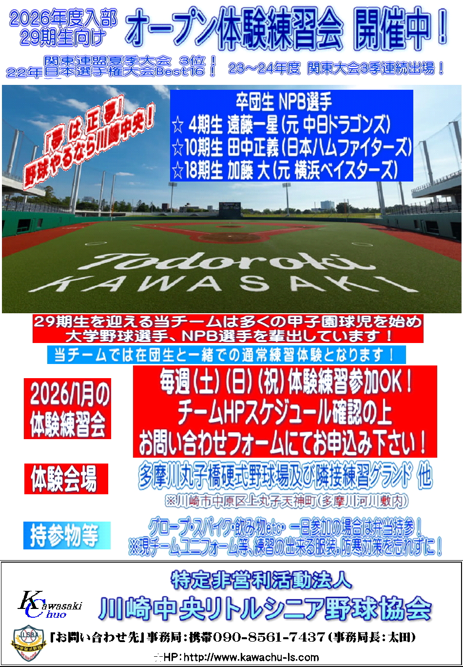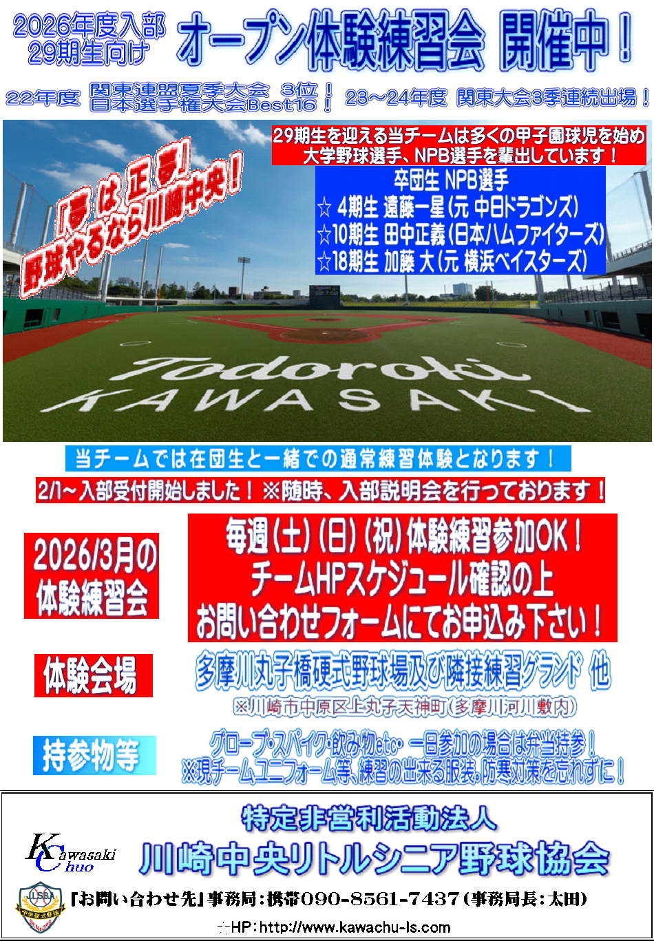 | 川崎中央リトルシニアに関するご質問などは [こちら] にお願い致します! |