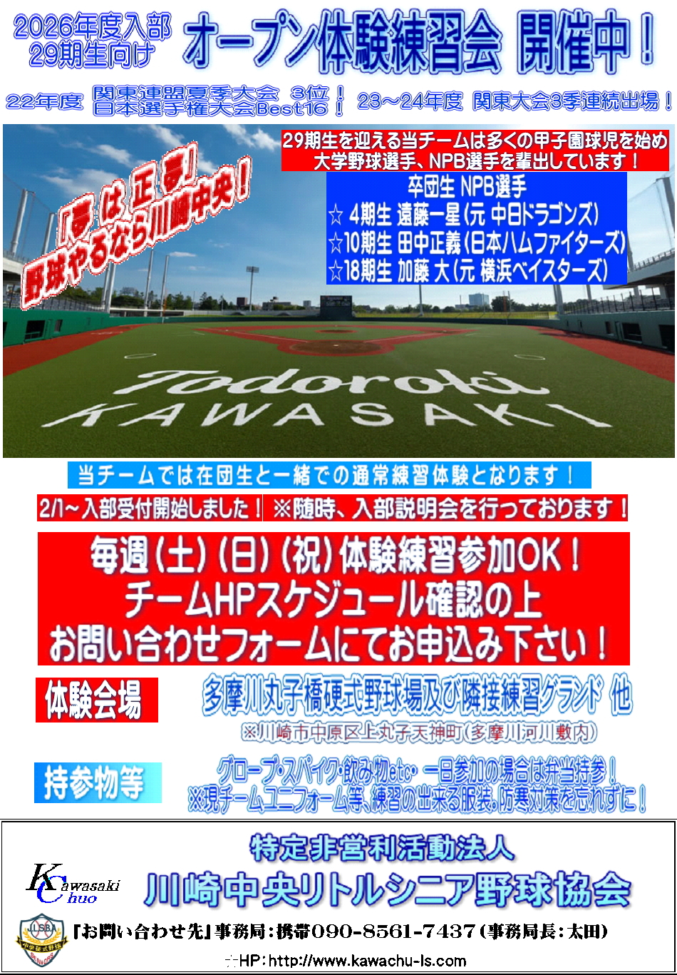 | 川崎中央リトルシニアに関するご質問などは [こちら] にお願い致します! |